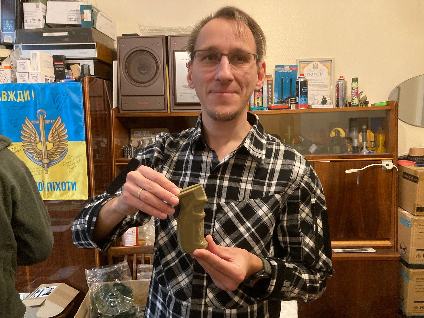 My daughter had died at the very start of the full-scale war. I had plastic left over from the 3D printing she’d done with her nephews. I called Ilya and said, I want this plastic to be used to avenge my daughter’s death. Then we began to talk more, and I bought some plastic.