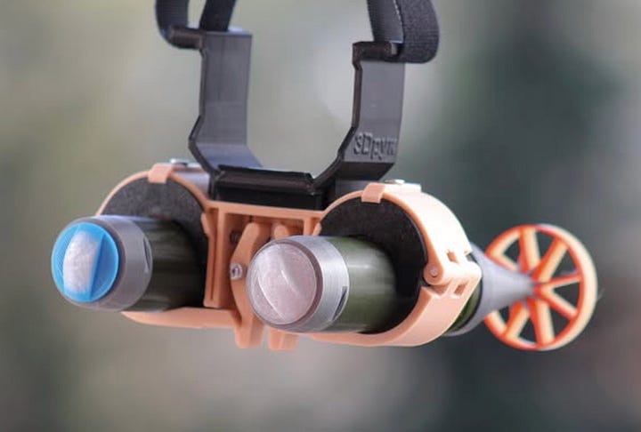 Illia: There are basic things that we constantly produce, that we’ve been making for a long time in large quantities. We’ve started making dropping mechanisms, which are quite complex. It’s system you can attach to [quadcopter] drones so they can carry things. Ammunition or even water. It can’t carry much, because the drones themselves are small. For example, when the dam was destroyed and part of Kherson was severely flooded, bottles of water were delivered to people this way.